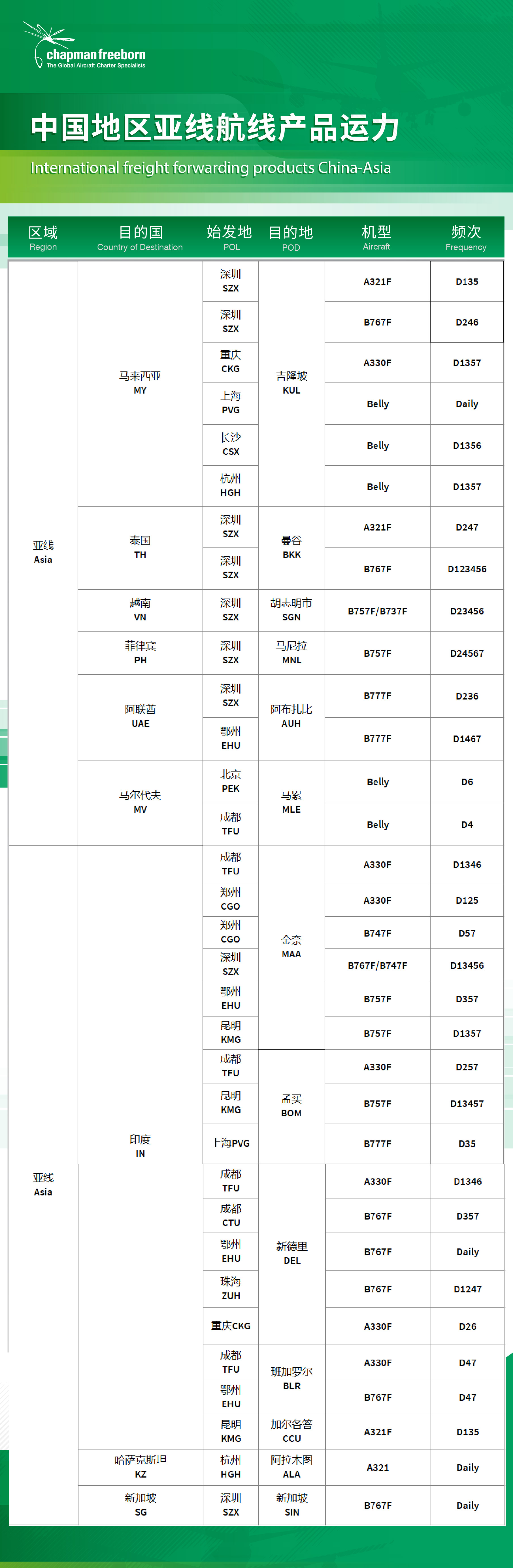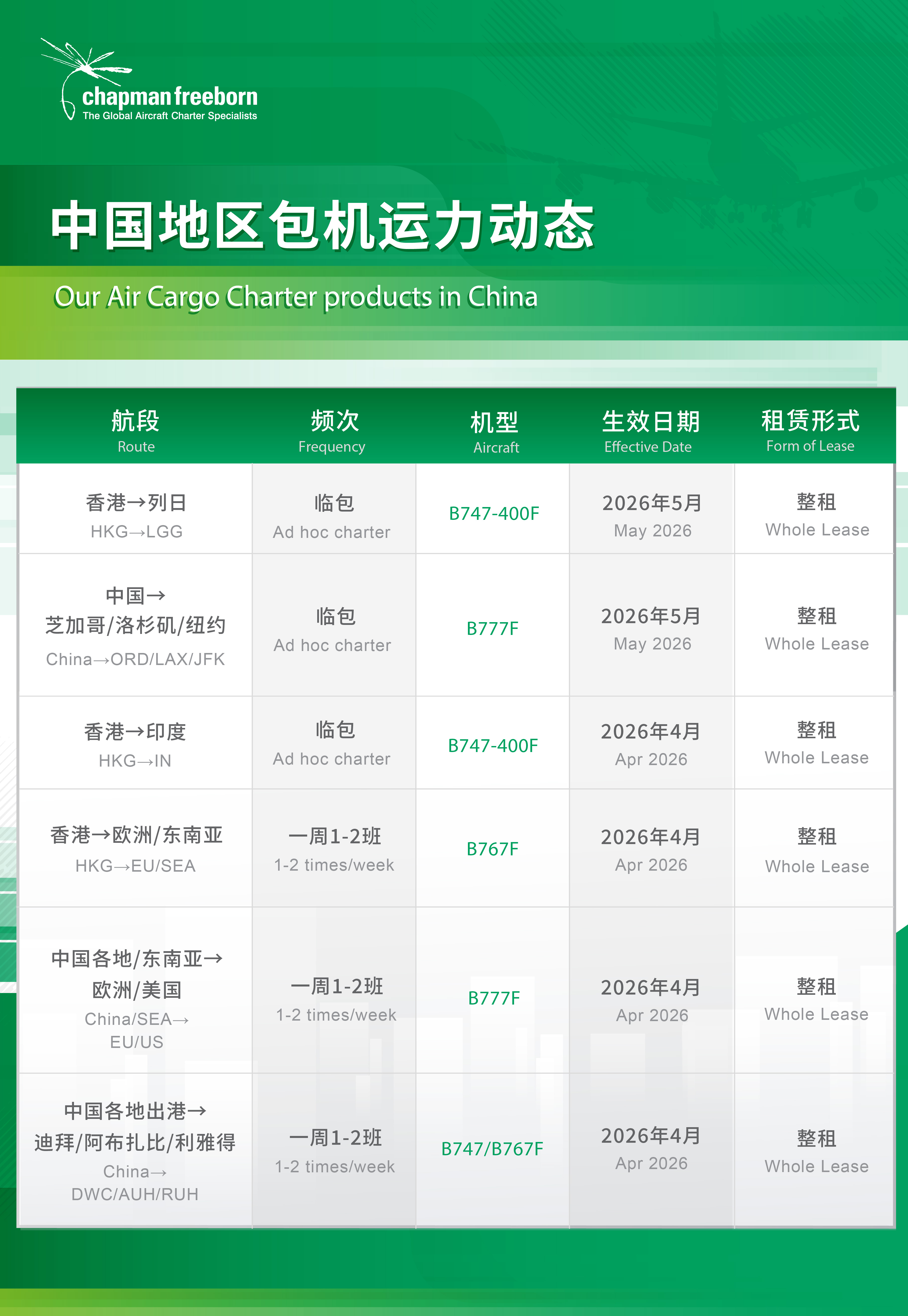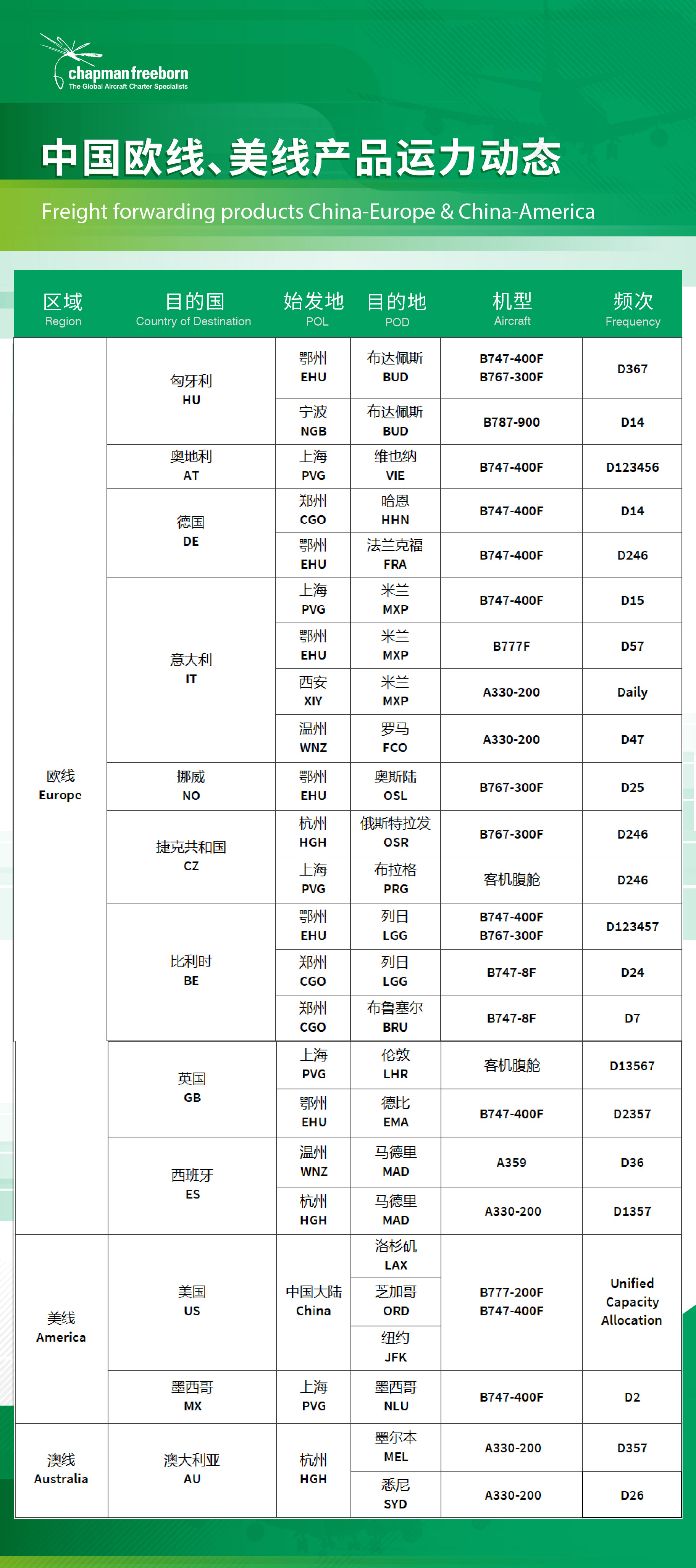 如果您有相关区域的紧急货运需求,或其他航线产品的整包/半包需求,欢迎通过邮箱china@chapmanfreeborn.aero或拨打24小时货运热线+86 21 52861816与我们联络,获取最新报价。